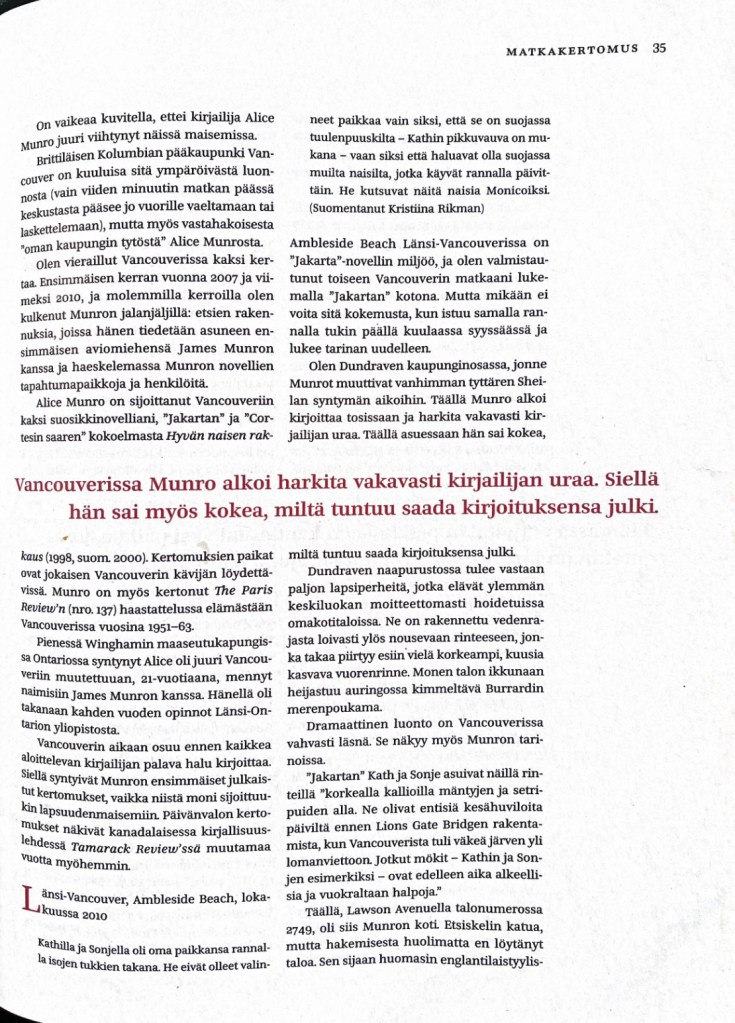 Halusin istua samalla mäntypuilta tuoksuvalla rannalla, kävellä samoja uneliaita katuja ja tarkkailla samoja ihmisiä kuin Munro oli tehnyt. Olin hullaantunut hänen tarinoistaan sen jälkeen kun luin novellista Punanaama seuraavan lauseen: ”Elämässä on joitakin paikkoja tai kenties vain yksi paikka, jossa jotakin on tapahtunut ja sitten on muita paikkoja.”