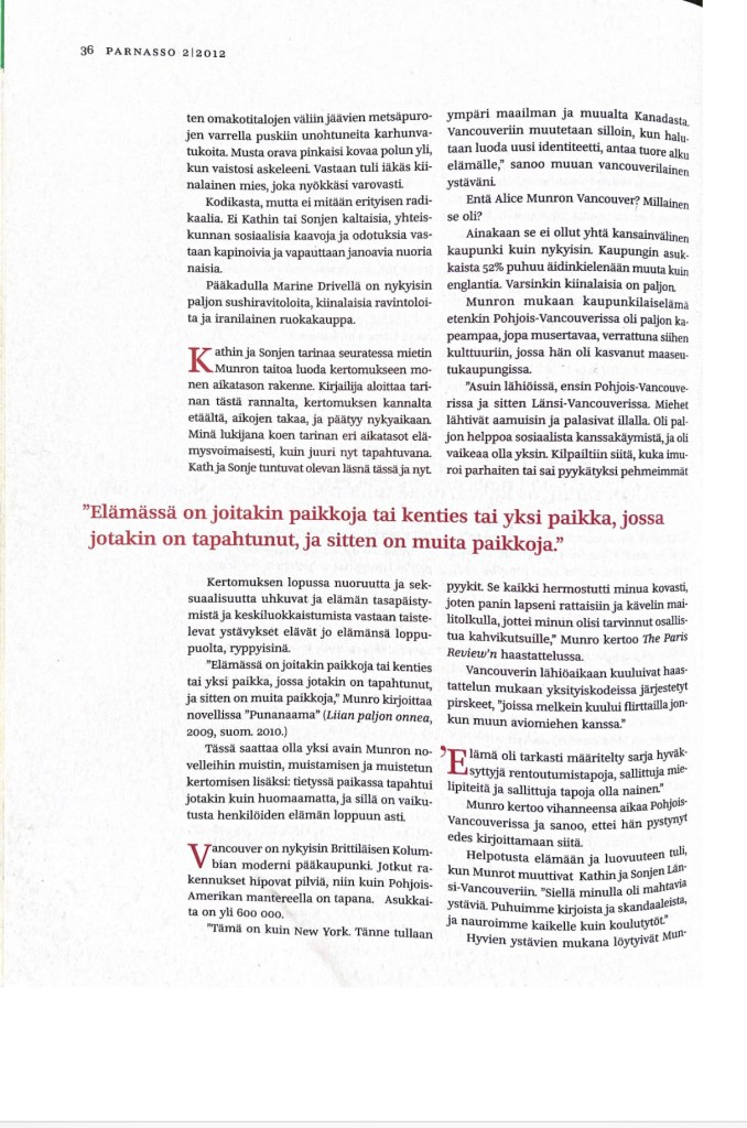 Seisoessani Munron kaksikerroksisen puutalon edessä Kitsilanon boheemissa kaupunginosassa eteläisessä Vancouverissa, ”jossa Munro pystyi omien sanojensa mukaan viimein hengittämään ja kirjoittamaan kertomuksiaan”, tunsin jo itseni urkkijaksi. Eikö kirjailijan ja lukijan välillä pitäisi säilyä jokin salaisuus? Olinko pääsemässä liian lähelle hänen yksityiselämäänsä ja kirjoittamisen motiivejaan? Pikku hiljaa tutkimusmatkani aikana aloin katua. Talot, paikat ja ihmiset Vancouverissa olivat paljastaneet jotain oleellista kirjailijasta, ne toivat kirjailijan liian lähelle, enkä enää halunnutkaan tietää kaikkea suosikkikirjailijastani. En edes sitä, että Munro oli eronnut aviomiehestään muutama vuosi kirjakaupan perustamisen jälkeen.